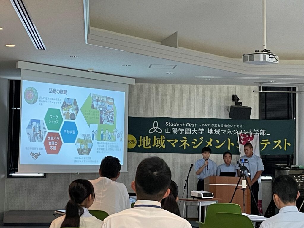 探究活動チームの1つである「福山ローズウィンドウプロジェクト」が、山陽学園大学主催「地域マネジメントコンテスト」に出場し、奨励賞を受賞しました。