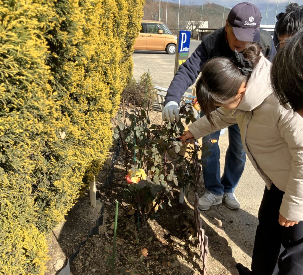 若松バラ園の小寺様に、バラの世話の仕方や選定の仕方を教えていただきました。葉の付け根にある芽を見て、外芽を残して枝を切るのだそうです。説明を聞いた後は実際に花壇にいって、みんなでハサミを入れていきました。